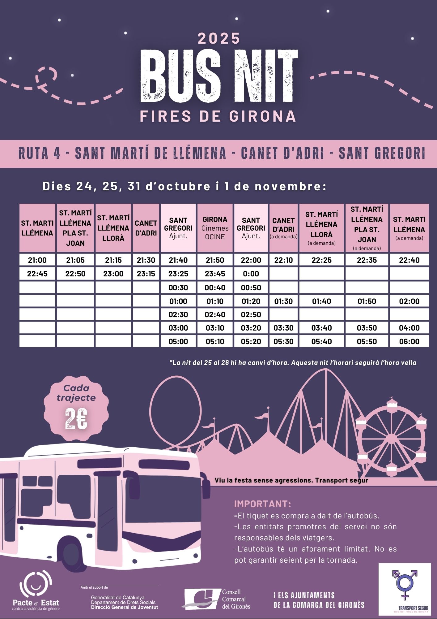 Actualitat BUS DE NIT – FIRES DE GIRONA 2025 13/10/2025 Torna a casa amb seguretat durant les Fires de Girona! 🚌 Hi haurà autobusos nocturns amb un preu de 2 € per trajecte. Compra el teu tiquet directament a l’autobús. < Entrada AnteriorEntrada Posterior >