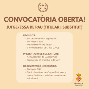 De conformitat al previst a l’article 101.3 de la llei Orgànica del Poder Judicial i l’article 5 del Reglament 3/1995, de 7 de juny, de Jutges de Pau, s’anuncia la convocatòria pública per a la provisió de Jutge de Pau Titular i Jutge de Pau Substitut del municipi de Canet d’Adri.