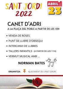 Agenda SANT JORDI A CANET D’ADRI 23/04/2022 DATA: dissabte, 23 d’Abril, 2022 LLOC: A la plaça del poble ACTES: venda de roses, intercanvi de llibres, tallers infantils, música en directe i vermut per a tothom. < Entrada AnteriorEntrada Posterior >